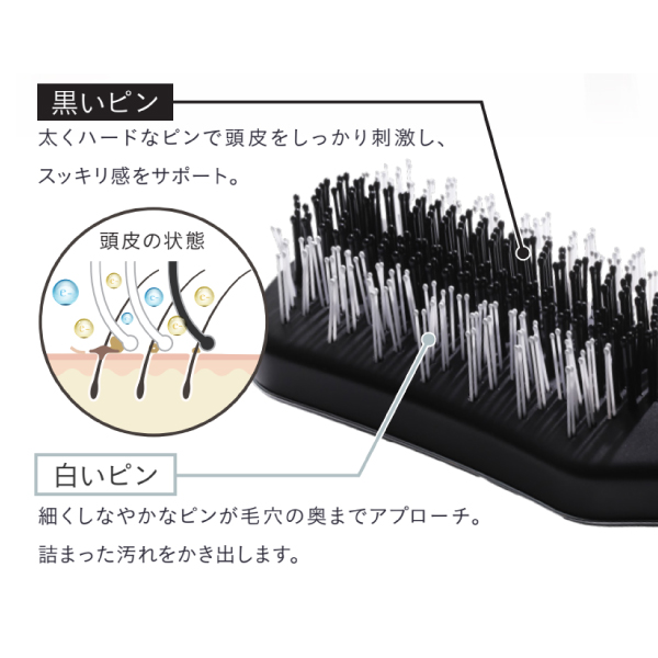 - 黒いピン:太くハードなピンで頭皮をしっかり刺激。スッキリ感をサポート