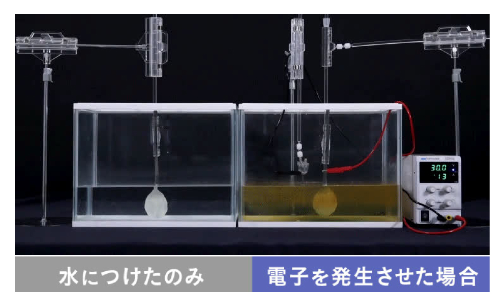 マヨネーズを塗布し、水につけても水は透明なまま。一方、電子を発生させた方は水が黄色く濁って、マヨネーズの汚れが落ちていることがわかります。