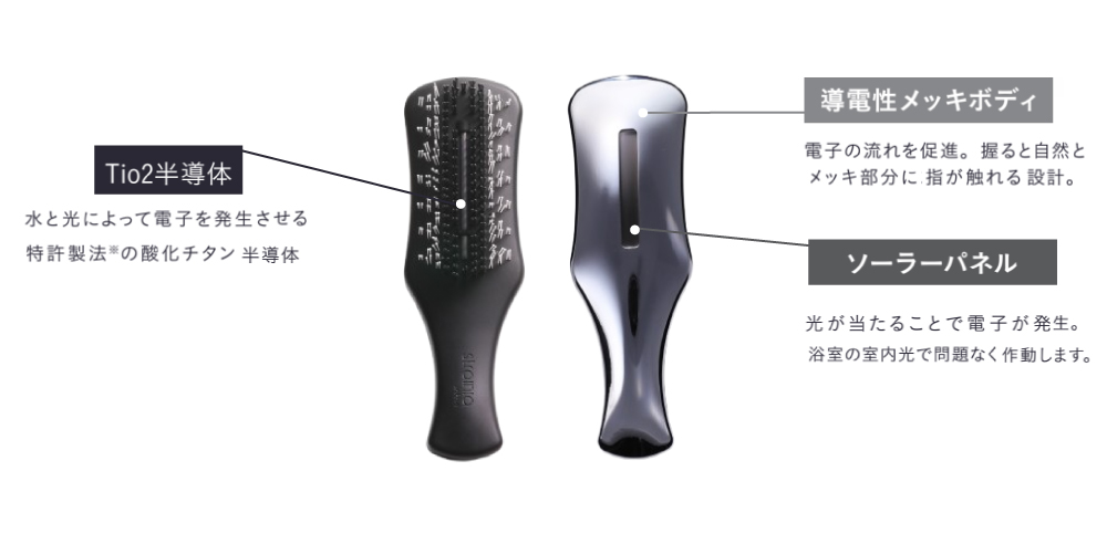 毛穴クレンジングの鍵は「電子」。このブラシは導電性メッキボディ・ソーラーパネル・TiO₂半導体の3つの構造により、光をエネルギーに電子を発生。浴室内の光でも作動し、自然な電子の流れが頭皮に伝わり、毛穴の奥の汚れを浮かせて落としやすくします。